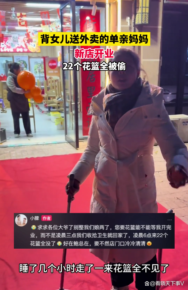 太丢人了!安徽安庆,一位单亲妈妈靠着背孩子送外卖攒钱,开了一家小饭店,没成想,新店开业第一天,门口22个花篮就全被偷走了,而且就发生在凌晨的三个小时内,女子:求求各位大爷别整我们娘俩了